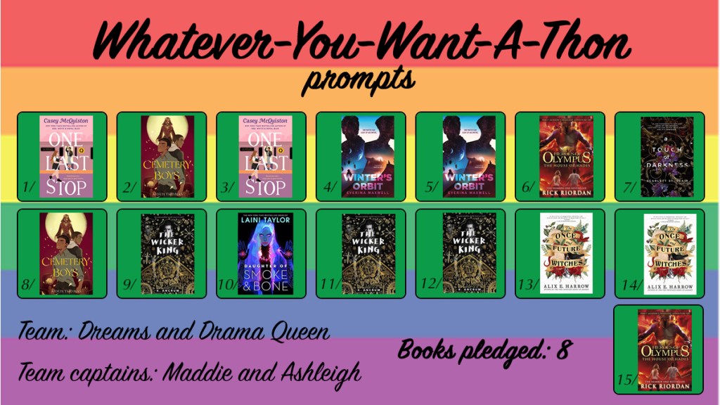 So for the readathon, I pledge to read a total of eight books. Each book will be 100 points, and if I read more than my goal, all the books over eight will be 200 points. Also, I can earn points if the book is LGBTQ+ (100 pts) or host fave (50 pts) or team genre (25 pts), which is low fantasy, whimsical, etc. and to fulfil a prompt it’s 25 points.
