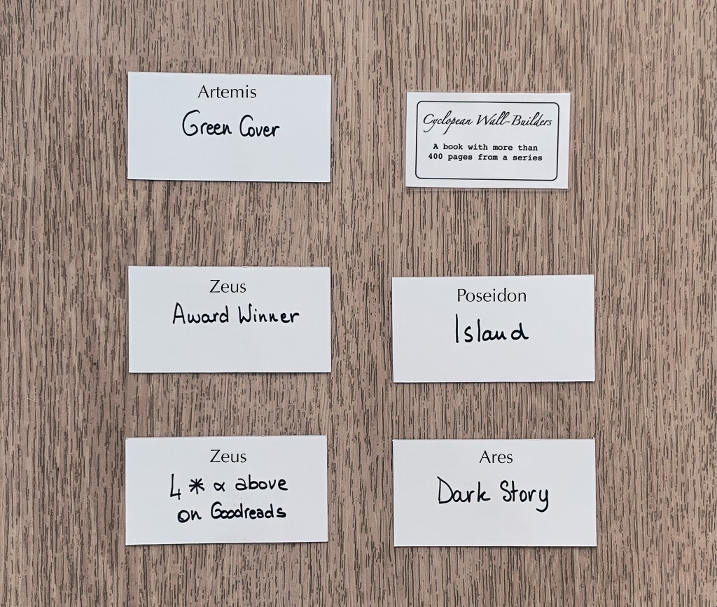 In July, I didn’t use my bonus card either for this Olympus TBR or during the month, so I still have my two cards: re-roll (for when I play Olympus TBR) and change a book (for the month.)
