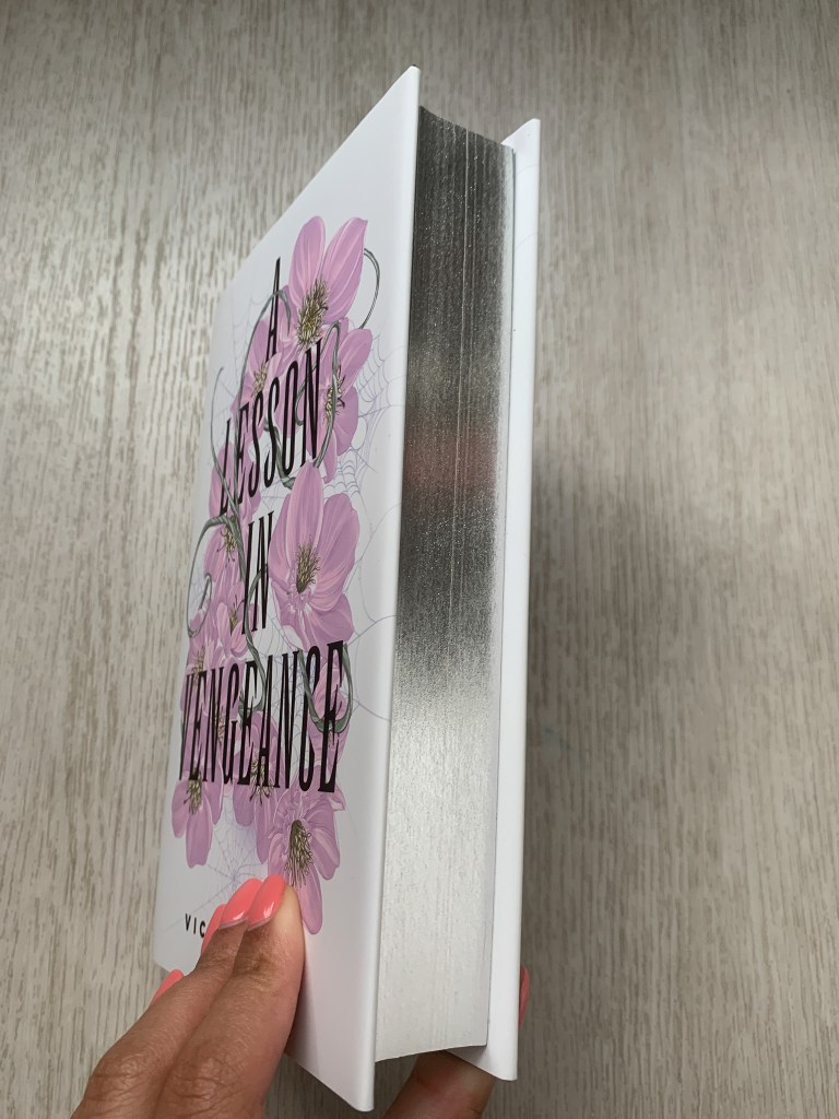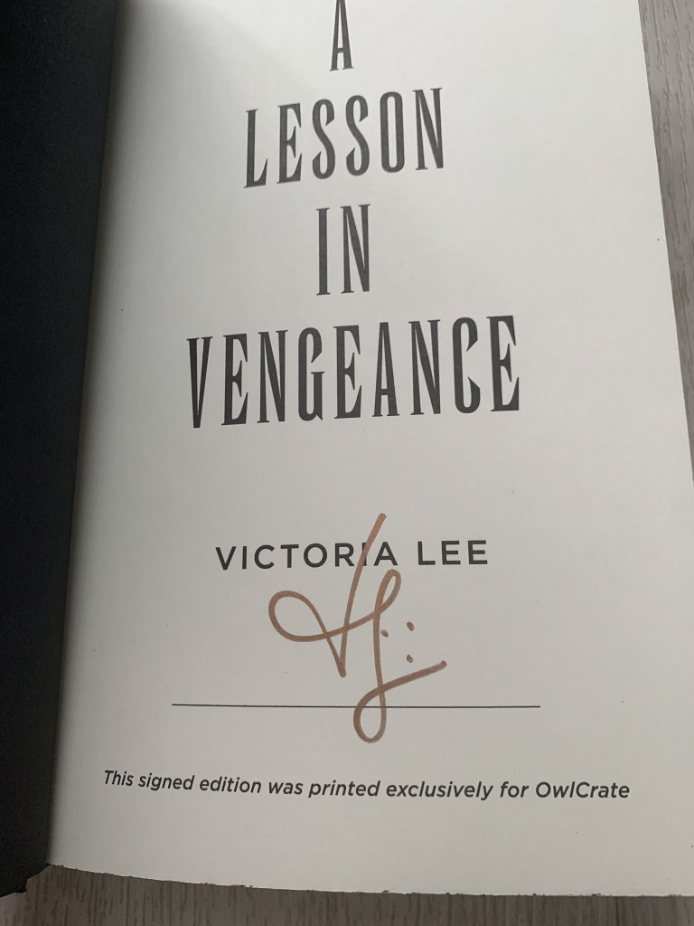 The book for August is A Lesson In Vengeance by Victoria Lee. This exclusive edition has a reversible white dust jacket designed by Nicole Deal, an exclusive foil design on the hardcover and silver gilded edges and is signed by the author.