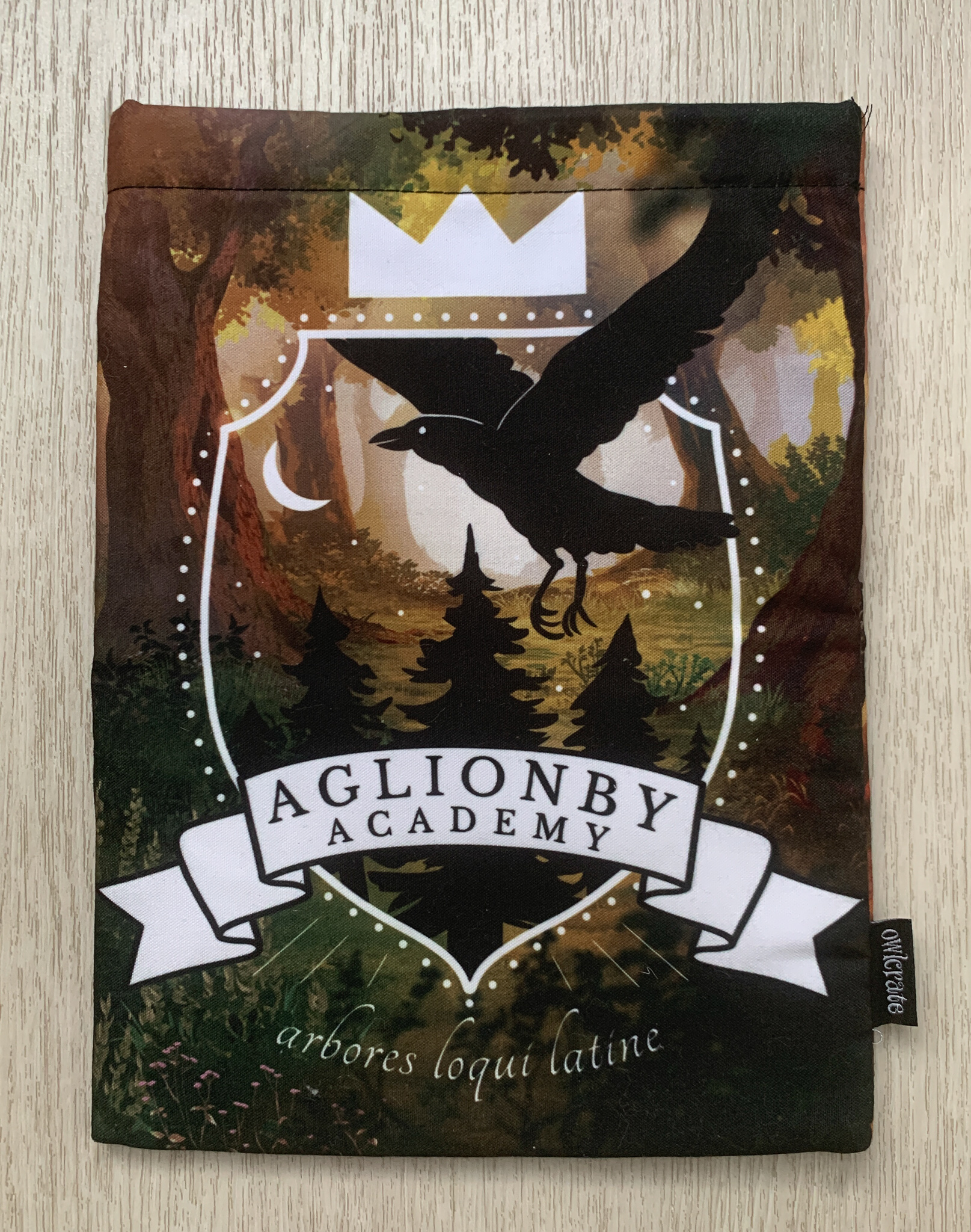 7. The last item before the book is a book sleeve designed by Dri Gomez and based on The Raven Boy by Maggie Stiefvater. You have two sides. The first is the set of characters and behind the Aglionby Academy crest.
