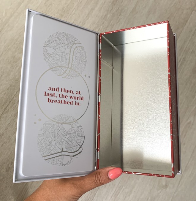 6. A white book tin box that is collectible (two of them were available in the two previous boxes.) It represents the White London in a Shade of Magic series by V.E. Schwab.