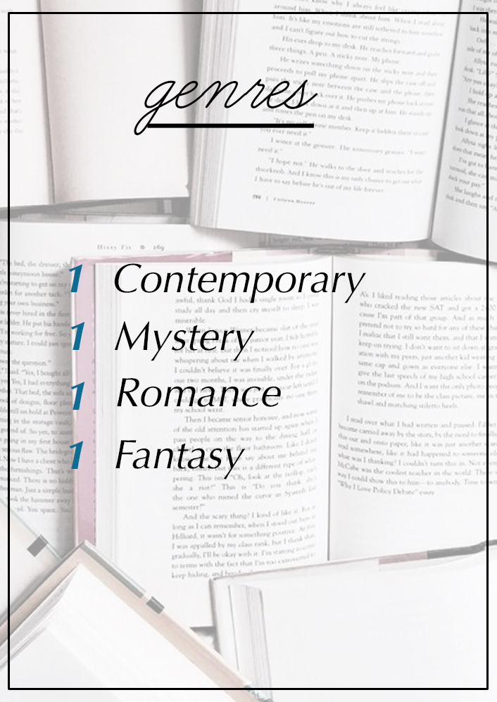 For the book I read, I don’t have duplicates in genres. I read all of them in physical format; I read a few pages in mixed media for one of the books, which is losing a life. All of the books have an adult as a target audience. Also, all of them were from authors that were new to me; one of them was a debut novel.