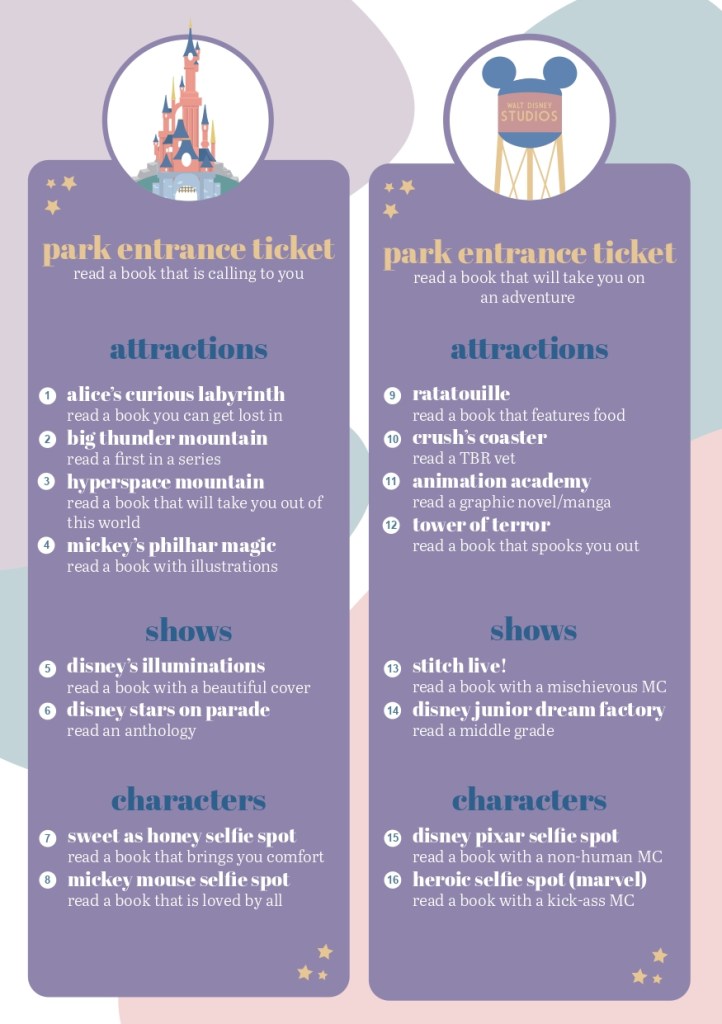 Fun fact: my cousin and her family were at Disneyland Paris during the last weekend of the readathon, and I met them there to have dinner with them. So I had a thought dor this readathon when I arrived there.