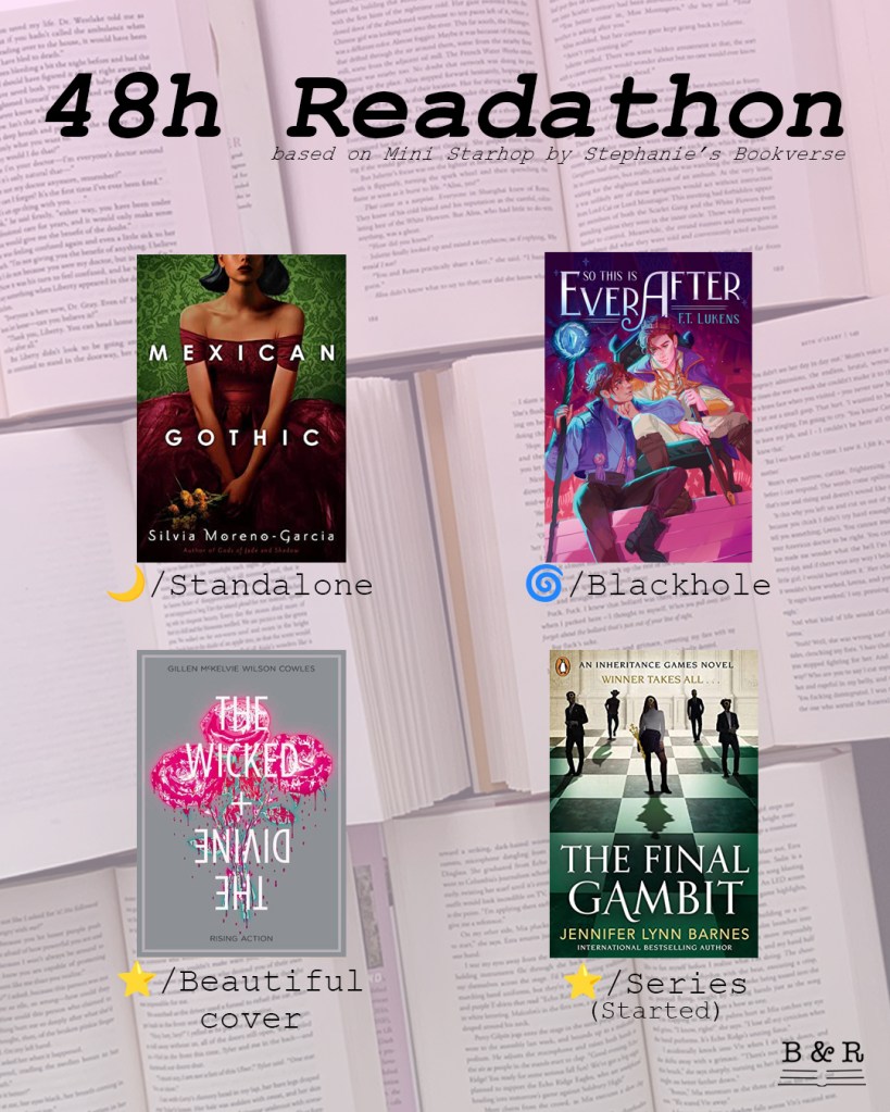 In October, I felt like I didn’t read enough, and I had the idea to do a 48 hours readathon from the 28th to 30th as I started it at 11am. The only thing was that I didn’t want to just read, and that’s it. I wanted to have some challenges, so that’s why I decided to do a Mini Star-Hop. This is a shorter version of Stephanie’s Bookverse (her channel) TBR game: Star-Hop.