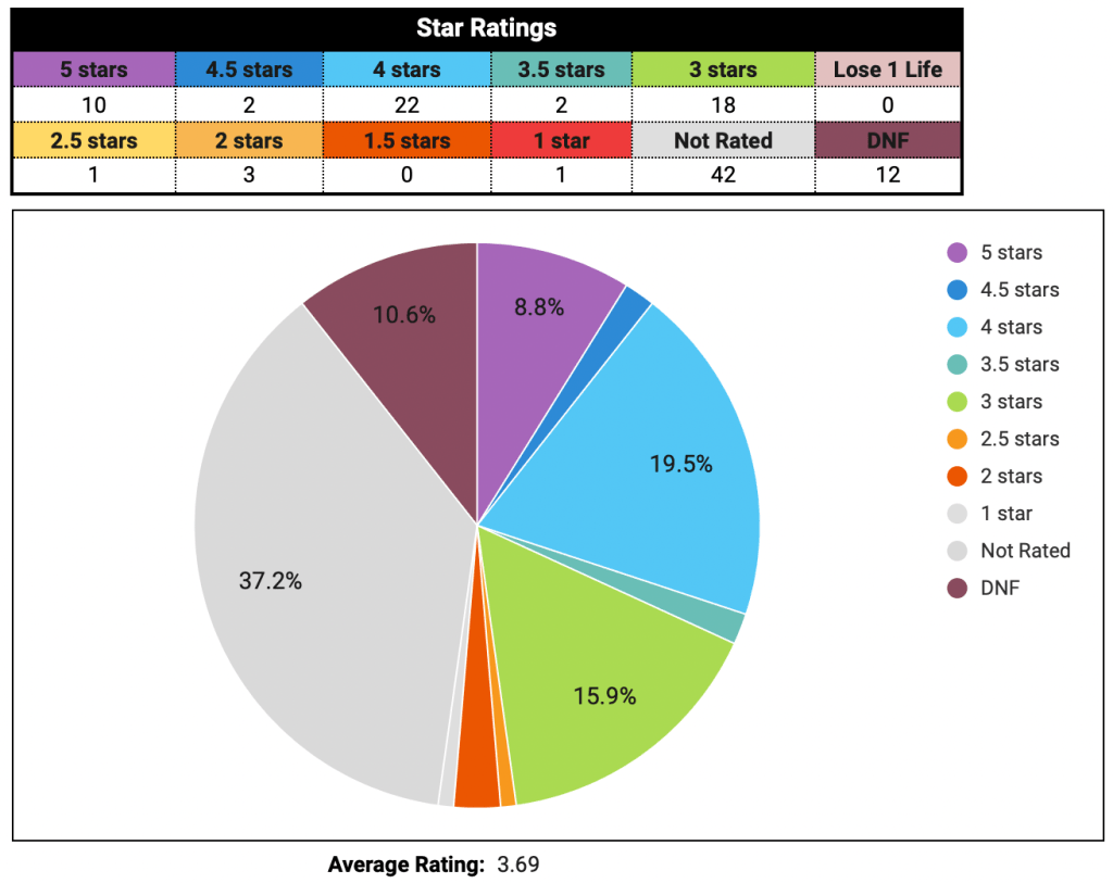 I can’t wait to compare them to 2023. Unfortunately, I don’t have any comparison as I didn’t do as many stats or at least detailed ones. I just can say that I read fewer pages as I read a ton of mangas which have fewer pages than a novel. However, I don’t really mind; I just want to appreciate the books I’m reading.