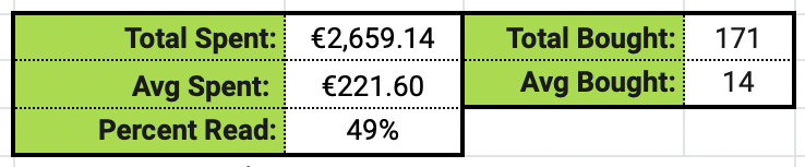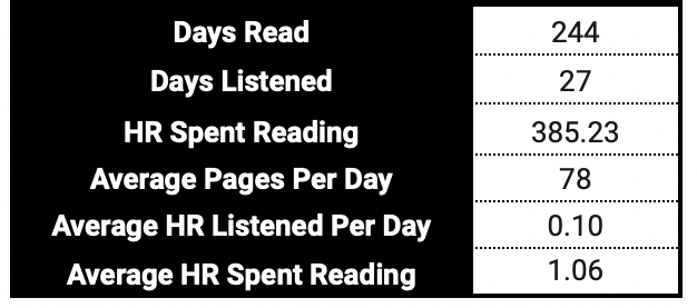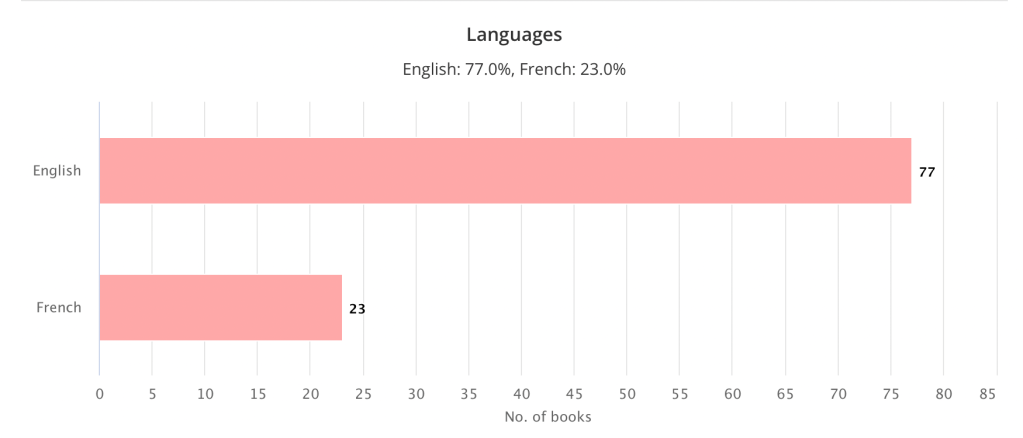 Those stats start on the 1st of January and end on the 22nd of December 2023. I have many of them, as I’m using different modules to collect them. First, the app Bookly which is an excellent help in calculating the amount of reading done in a day; second, the Storygraph website, which is more general stats but still, I love it. Lastly, google sheet were I merged HardbackHoarder’s spreadsheet (channel) and the CAWPILE by Book Roast (channel) one. I just made some changes to it so it would match my readings and the stats I want to have.